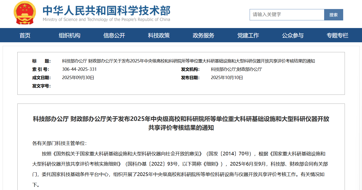 近日,科技部办公厅、财政部办公厅联合发布《关于发布2025年中央级高校和科研院所等单位重大科研基础设施和大型科研仪器开放共享评价考核结果的通知》。在全国344家参评单位中,北京大学荣获“优秀”评价。这是继2023年获此荣誉后,我校再次获评优秀。