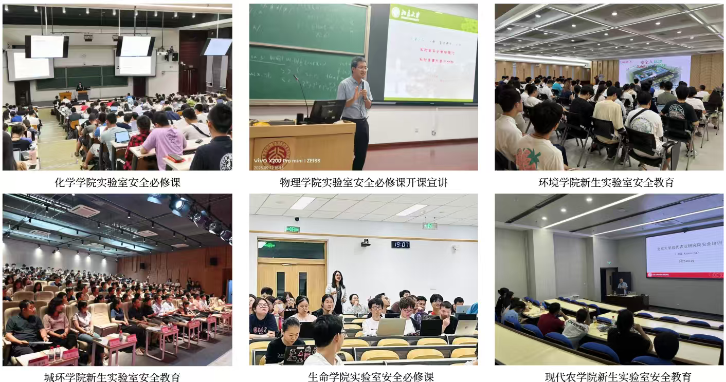 2025新生实验室安全教育以多种形式开展,覆盖全校理工科学院。物理学院、化学与分子工程学院、生命科学学院、材料科学与工程学院等12个学院启动实验室安全必修课学习,本学期共安排约 244 课时;电子学院、集成电路学院、地球与空间科学学院3个学院组织新生通过“北京大学实验室安全教育与考试系统”进行线上学习、考核。此外,城市与环境学院、环境科学与工程学院、现代农学院3个学院在新生教育中设置实验室安全专题学习,全方位强化新生安全意识。
