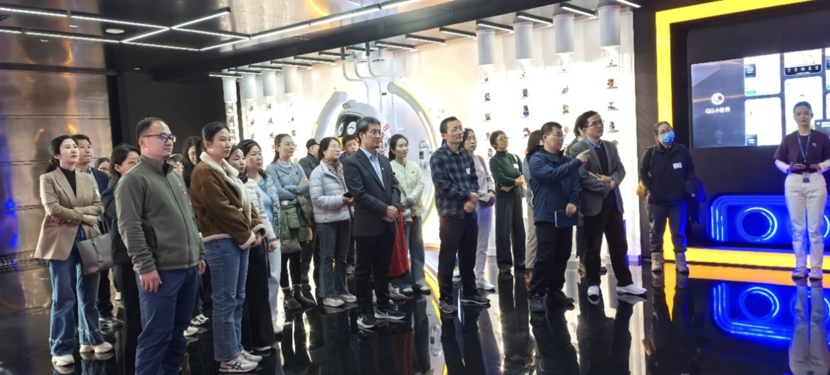 实地观摩环节,讲解员引导大家参观了腾讯数字科技展厅,介绍了腾讯在其27年的发展历程中从即时通讯到大数据、人工智能、云计算等前沿技术领域的创新实践,展示了AI技术赋能产业升级,融入各行各业的应用案例,老师们近距离的感受到AI技术的迅猛发展和应用前景。